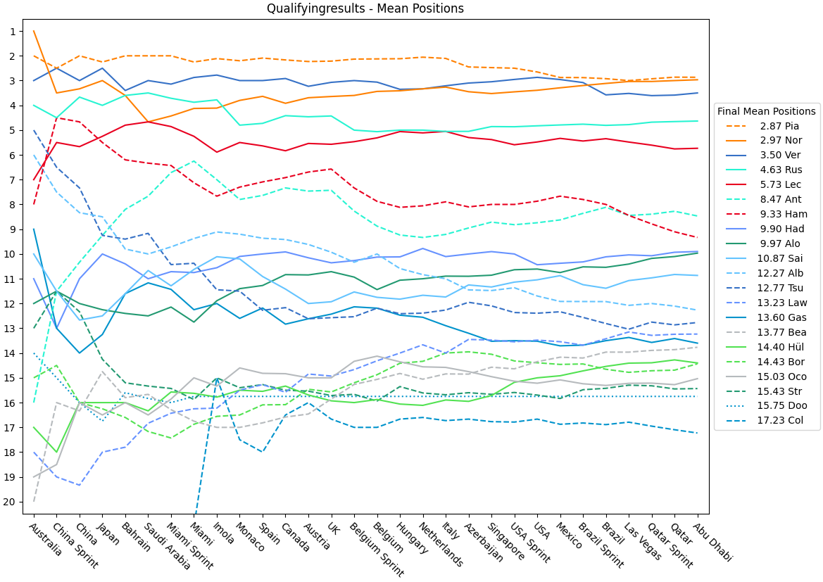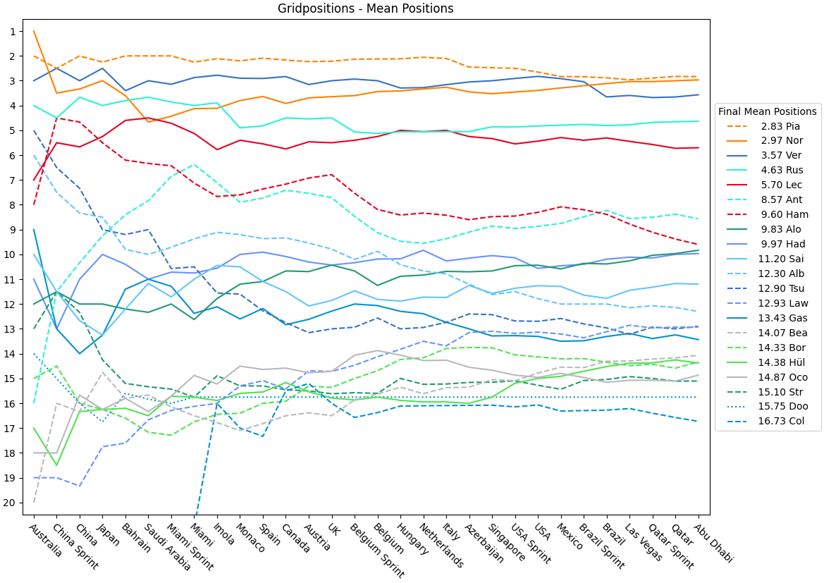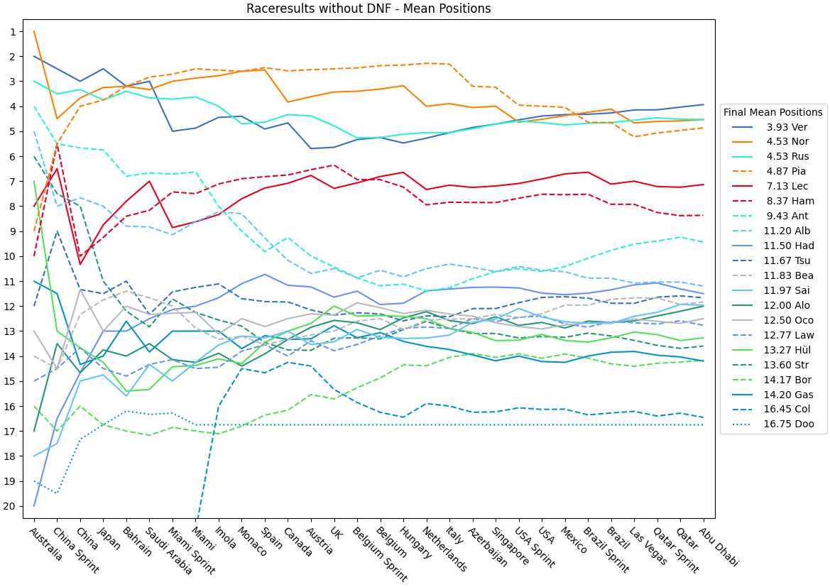| Verstappen | 2.00 | 2.50 | 3.00 | 2.50 | 3.20 | 3.00 | 5.00 | 4.88 | 4.44 | 4.40 | 4.91 | 4.67 | 5.69 | 5.64 | 5.33 | 5.25 | 5.47 | 5.28 | 5.05 | 4.85 | 4.71 | 4.55 | 4.39 | 4.33 | 4.32 | 4.27 | 4.15 | 4.14 | 4.03 | 3.93 |